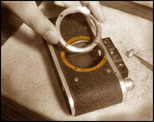 If focusing remains inaccurate even after the camera rangefinder is calibrated, it may be the lens which is at fault.. It has to adjusted as well, to conform with the newly-adjusted camera’s focus register. The lens can be checked with another camera (whose lens register has been proven correct) with a removable back, using the groundglass focus method. Point the camera and lens towards a very distant object. Keep the camera’s shutter open, and place a focusing ground glass on the film plane (the rough side facing the lens, and the glass should bear on the film rails). Observe the sharpness of the focused object. If the object appears sharp, and the lens’s distance scale reads ‘infinity’, then the lens is properly adjusted.