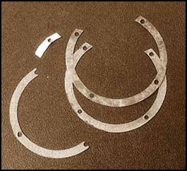 Shims found under the lens mount: whenever the lens mount is removed, or the camera disassembled, try to remember where the paper spacers were originally found. They were placed there to give the correct lens working distance specifically to the camera body. Paper is the common material used. Each disassembly and reassembly requires subsequent measurement of the lens flange to film distance, which may require addition or removal or rearrangement of the shims. |