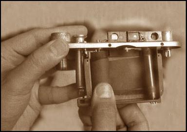 This is perhaps the most difficult step in the process. Remember, you are attempting to put back not only the shutter crate, but several parts as well. In this step, the coupling pin, the shutter rollers, and the drum should all get in together, correctly, in one stroke. The pin has to go through the shutter drum’s hole correctly. The restricting gear has to engage with the gears of the advance and release mechanisms. The shutter release button itself has a metal spinet with a gear on its end– and this will fall off during the reassembly. Dab it with some grease so it will “stick” into the shutter’s shaft. And then, getting the ends of the spring rollers into their holes at the top plate can be very challenging. BE VERY PATIENT– such is hardly achieved the first time. Many, many attempts may be necessary to get it right. |