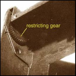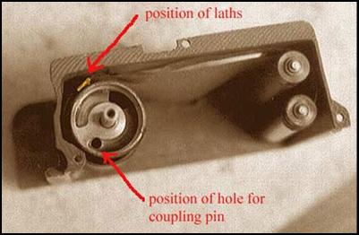 The lath should be at this position. Install the drum into its slot with the restricting gear turned all the way to its rightmost limit(when seen from the top). The coupling hole should be positioned in such a way that when the crate is installed and the coupling pin on the top plate enters it, the pin’s upper arm should point where it was marked prior to disassembly. The restricting gear is found at the bottom left side of the shutter crate, and is the only gear, or part, for that matter left attached to the crate when all the other parts have been removed. Before installing the drum, the restricting gear has to be turned clockwise until it stops and should remain in that position when the shutter drum is replaced. In the left photo, the drum shouldn’t be able to turn clockwise anymore, if the drum was correctly installed in relation to the restricting gear. It should however be able to turn clockwise, with the curtains going to the side of the spring loaded rollers. |